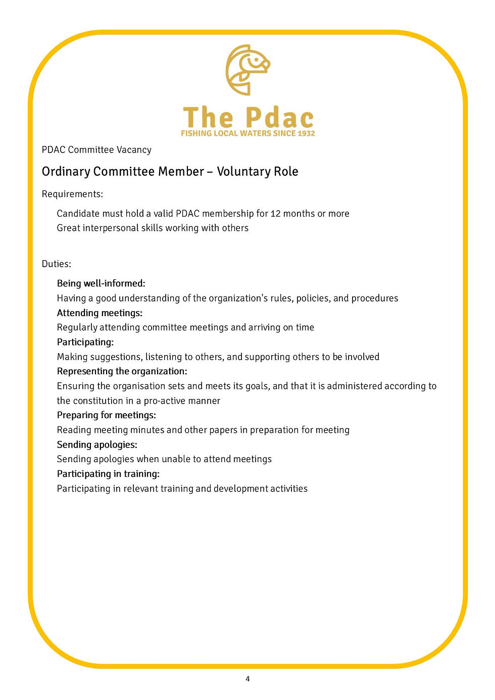 We also want to remind members that there are several vacancies on the committee. We encourage anyone interested, who has been a PDAC member for at least 12 months, to inform the committee before the meeting or come forward with a proposer during the meeting when requested.